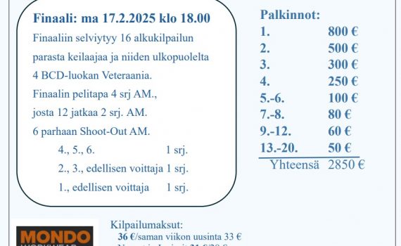 FINAALITULOKSET https://kilpailut.keilailu.fi/competitions/19178/ ALKUKILPAILUT ON NYT PELATTU ! Onnea finalisteille! Alkukilpailun perusteella naisten MAB mestaruus kirjataan luokkien ainoalle osallistujalle Heli Rossille. Onnea! Kaikki kaksi tulosta heittäneet naiset Helin lisäksi (Salminen-Riikonen Pirjo, […]