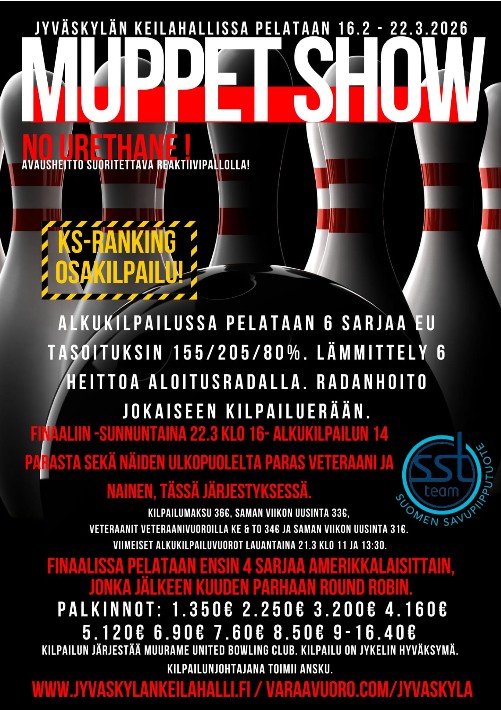 MuppetShow2026 16.2-22.3.202616.2.2026 in Erikoiskilpailut kirjoittajalta Jykeli Keski-Suomen Ranking. Kisaa pisteistä omassa luokassasi! – Jyväskylän keilailuliitto