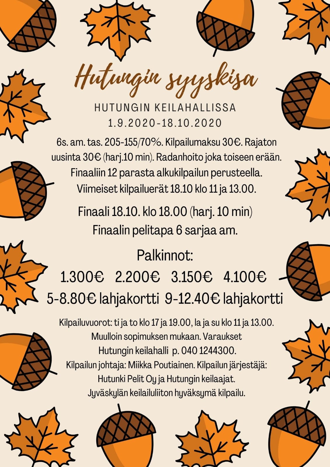 Hutungin syyskisa Arttu Mattilan nimiin31.8.2020 in Erikoiskilpailut_old / Liitto tiedottaa_old kirjoittajalta Anna-Riikka Andersson Pelataan ajalla 1.9. – 18.10.2020 TULOKSET FINAALIN TULOKSET TARKEMMIN TÄSSÄ LINKISSÄ Kilpailuilmoitus Lataa Rataolosuhde Lataa